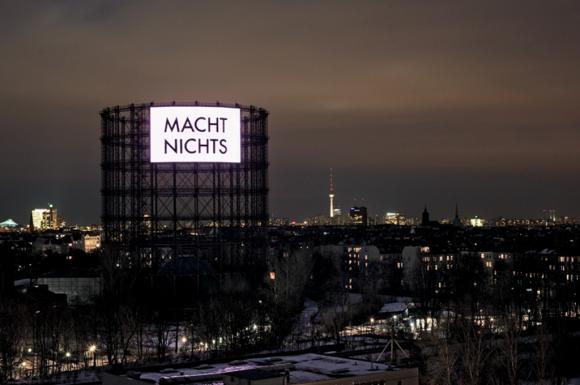 The two simple German syllables 'MACHT NICHTS' appear on the screen. When reading them closely, an ambiguity of meaning shines through. A stunning German wordplay unfolds, a double meaning, which is staggering but hard to translate: on the one hand 'MACHT NICHTS' could mean 'it does not matter, it’s not so bad', on the other hand it could be the imperative 'don’t do anything' or 'do nothing'. However, these words could also just be the nouns 'power' (Macht) and 'nothing' (Nichts). The absence of a sender makes the message’s ambiguity uncanny and thought-provoking: am I being told to take it easy or told to remain passive? A reversal of advertising strategies seems to be at play: are we being instructed not to do anything? To stand still and not to fulfill the claims of advertisement - to work, shop and consume? Is this comforting? Does it matter, if we don’t do anything? Clemens Wilhelm’s 'MACHT NICHTS' interrupted the advertisements on Berlin’s Gasometer Nightscreen for one night in February 2010. The work now returns for the Media Facades Festival.